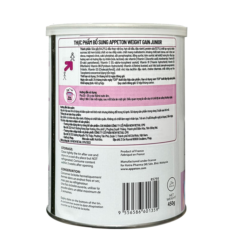 Sữa Appeton Weight Gain Junior là thương hiệu rất nổi tiếng đến từ Pháp với thức uống dinh dưỡng được thiết kế dành riêng cho trẻ từ 3 đến 12 tuổi, giúp trẻ tăng cân khỏe mạnh và hoàn toàn tự nhiên. Đặc điểm chính với dòng sản phẩm này là công thức khoa học giàu Protein hội tụ đủ 3 yếu tốt then chốt giúp cơ thể tăng cân. Ngoài ra trong sữa còn có dưỡng chất dễ tiêu hóa L-Protemax và các chất dinh dưỡng cần thiết cho mô phát triển, giúp trẻ ăn ngon, tăng cường và phát triển tốt chiều cao và tăng sức khỏe.