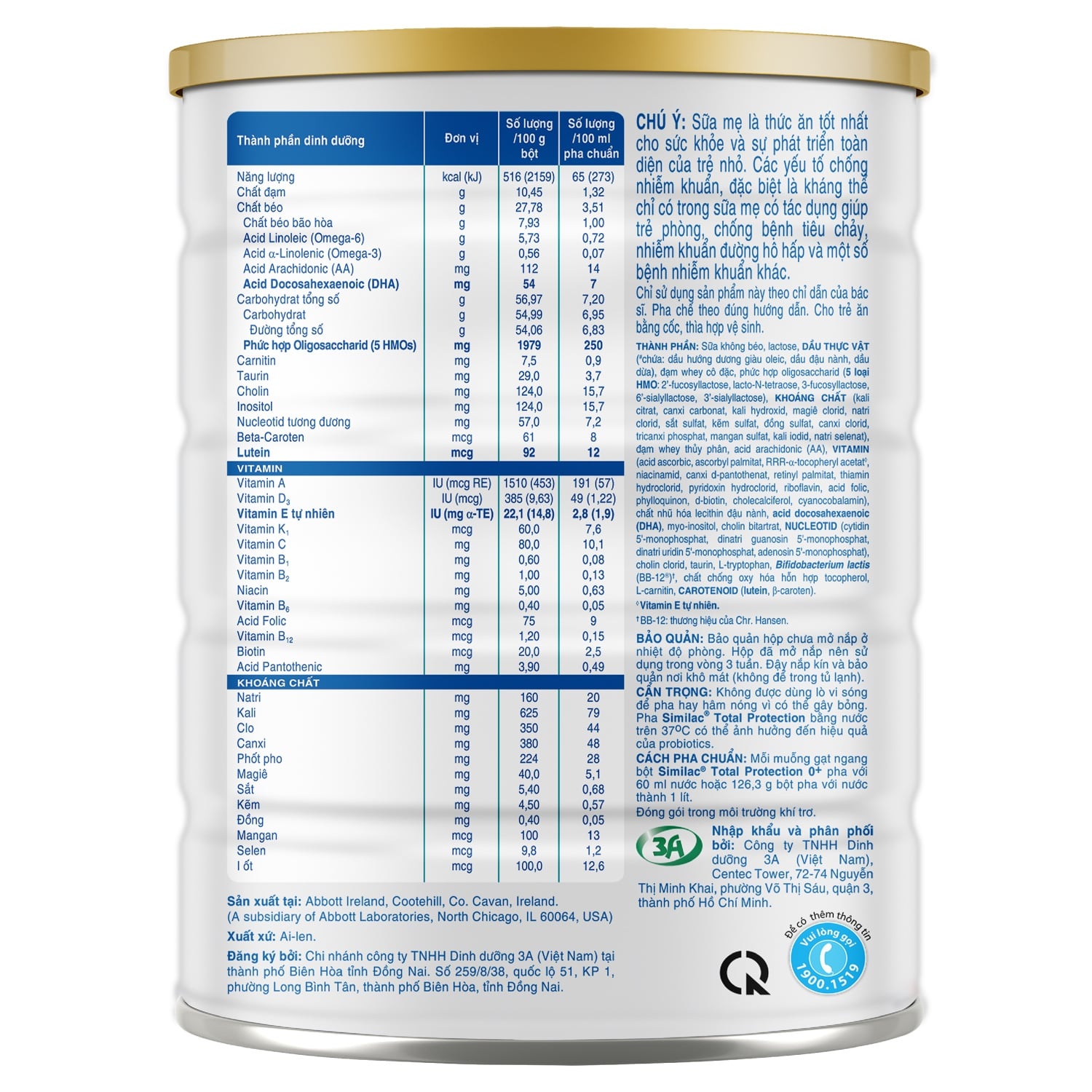Sữa Similac Total Protection 0+ là sản phẩm bổ sung dinh dưỡng hoặc thay thế bữa ăn cho trẻ 0-12 tháng tuổi bị thiếu hoặc mất sữa mẹ. Sản phẩm không chỉ an toàn mà còn cung cấp đầy đủ dưỡng chất thiết yếu cho sự phát triển của con. Sản phẩm bổ sung dinh dưỡng cho trẻ 0 - 12 tháng, cung cấp các dưỡng chất quan trọng giúp phát triển trí não, tăng cường sức khỏe hệ miễn dịch và hệ tiêu hoá, bảo vệ trẻ khỏe mạnh để phát huy các tiềm năng phát triển ở trẻ.