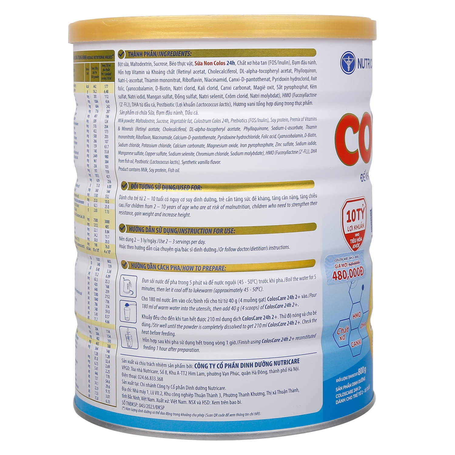 Thành phần sữa bột ColosCare 24h 2+ 800g dành cho bé từ 2-10 tuổi