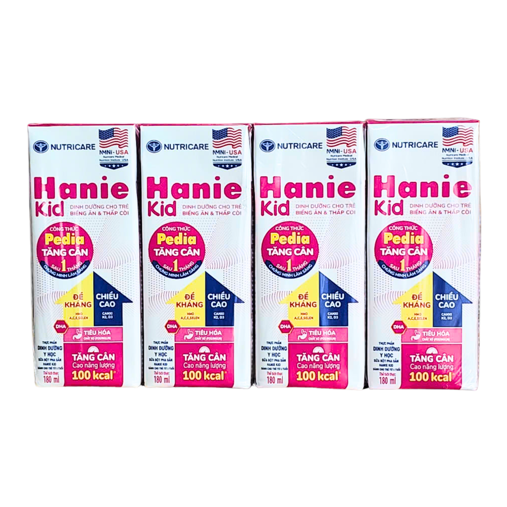 - Sữa Hanie Kid là sản phẩm chuyên biệt dành cho trẻ nhẹ cân, thấp còi với công thức Pedia cao năng lượng 100 kcal/100 ml, đáp ứng tiêu chuẩn khuyến nghị của Tổ chức Y tế Thế giới. Với nguồn đạm sữa chất lượng cao và các dưỡng chất như HMO, FOS, sữa Hanie Kid hỗ trợ tiêu hóa và hấp thu tốt, giúp bé tăng trưởng khỏe mạnh mà không lo nóng hoặc táo bón.
