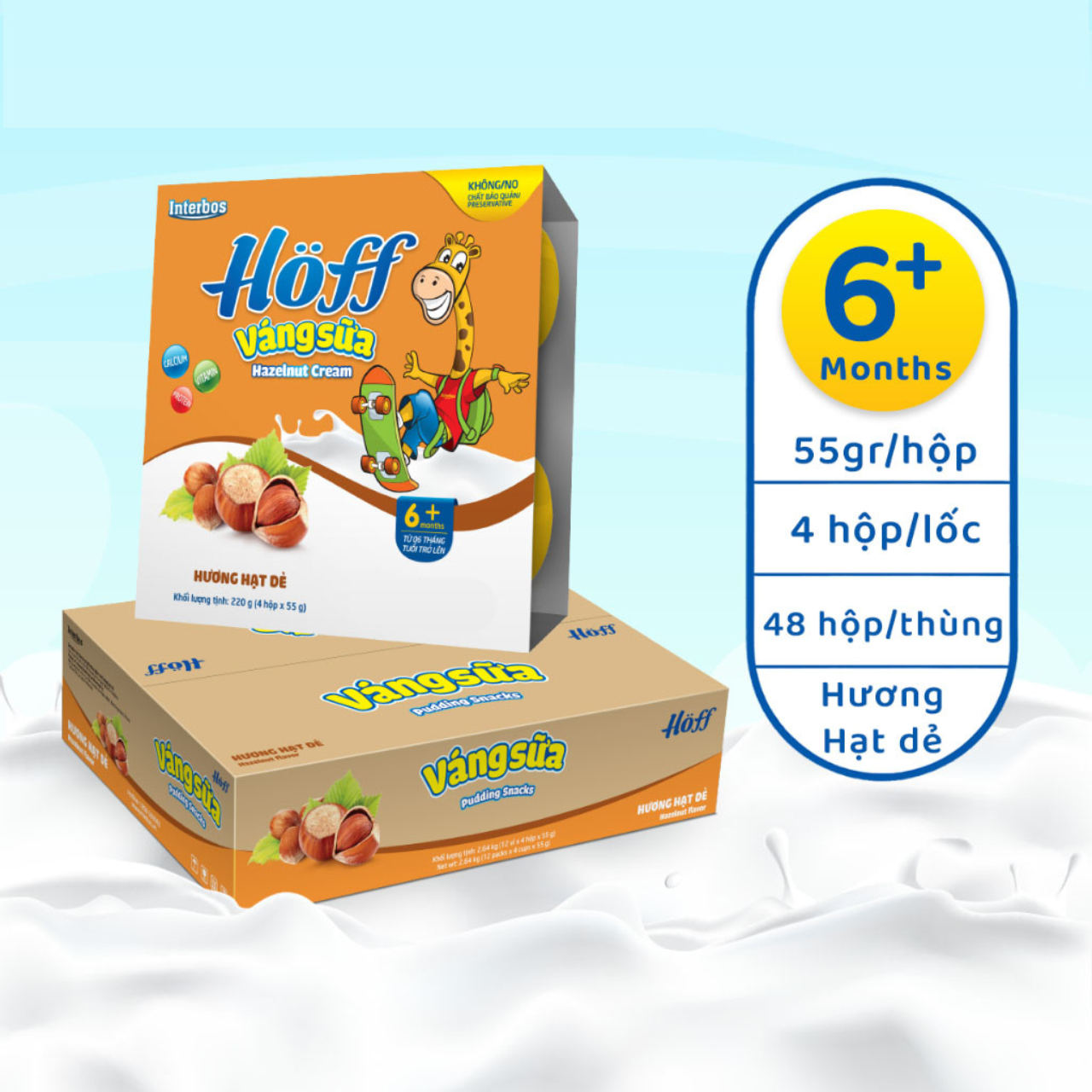 - Váng sữa Hoff vị Hạt dẻ là món tráng miệng, ăn bổ sung giàu dinh dưỡng được sản xuất từ sữa, bổ sung thêm các dưỡng chất cần thiết cho bé, trong đó thành phần cao nhất là chất béo (có trong kem sữa). Chất béo giúp ngăn cách các dây thần kinh, cải thiện khả năng học tập, phát triển chức năng của mắt, cung cấp năng lượng và giúp cơ thể hấp thu vitamin A, D, E, K.